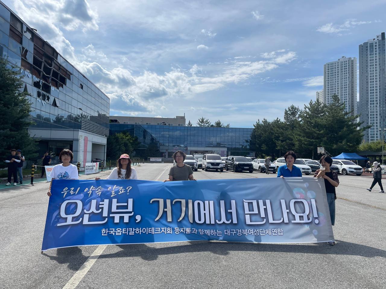 한국옵티칼하이테크지회에서는 박정혜동지의 건강을 최우선으로 하고, 정부의 옵티칼 노사교섭 개최 약속과 먹튀방지법 약속을 믿고 고공농성을 해제하기로 했다고 한다. 고공농성 해제 소식을 듣고 지난해 3월부터 함께 연대해 온 대구경북여성단체연합(이하 대경여연) 단체들과 바쁜 일들을 제쳐두고 당일 구미로 달려갔다. 작년 12월 대경여연과 함께 한 크리스마스 행사에서 두 동지는 고공에서의 농성이 길어질수록 일상의 대화를 나눌 일이 줄어든다고 했다. 그래서 대경여연에서는 한 달에 한 번 온라인으로 동지들과 만났다. 일상도 나누고, 게임도 하고, 영화를 본 뒤 이야기도 나눴다. 땅에 내려오면 바다가 보이는 아름다운 카페에서 두 동지에게 맛있는 빵과 커피를 사주겠노라 모임에 참가한 이들이 약속했다. 약속을 이행할 수 있어 기쁜 마음으로 ‘우리 약속 알죠? 오션뷰 거기에서 만나요!’를 적은 현수막을 들고갔다. 박정혜 동지가 고공에서 지회 깃발을 들고, 조합원들이 마련한 신발을 신고 땅을 딛는 순간, 우리는 아픔과 기쁨의 눈물이 흘렀다.