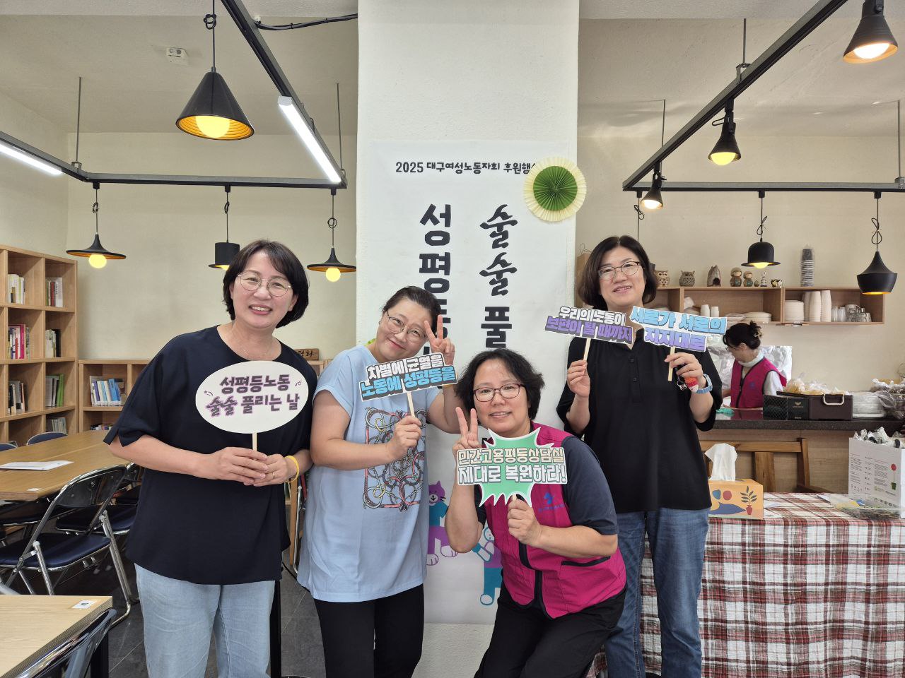 2025 후원행사를 준비하면서 지난 시간을 되돌아보게 되었어요. 윤석열 정부가 갑자기 민간고용평등상담실을 없애고 직접 운영으로 바꾸면서 여성노동자를 밀착지원하는 상담체계가 무너지기 시작했습니다. 그러나 23년 ‘서로가 서로의 지지대로’ 후원행사부터 24년 ‘여성노동자 으라차차’, 올해 ‘성평등노동 술술 풀리는 날’까지 지역의 많은 연대의 힘으로 버텨낼 수 있었습니다. 그 힘으로 직장에서 여성노동자들이 겪는 성희롱, 괴롭힘, 부당해고 등을 지원하며 상담도 이어올 수 있었구요. 12.3 내란사태부터 파면까지 123일, 광장에서 지치지 않고 깃발을 들기도 했습니다. 마침내 새로운 정부에서 민간고용평등상담실 복원이 국정과제에 포함되었습니다. 짧은 시간 많은 일들이 우리를 거쳐갔습니다. 여러분들의 연대와 응원이 없었다면 외롭고 힘들었겠지요?