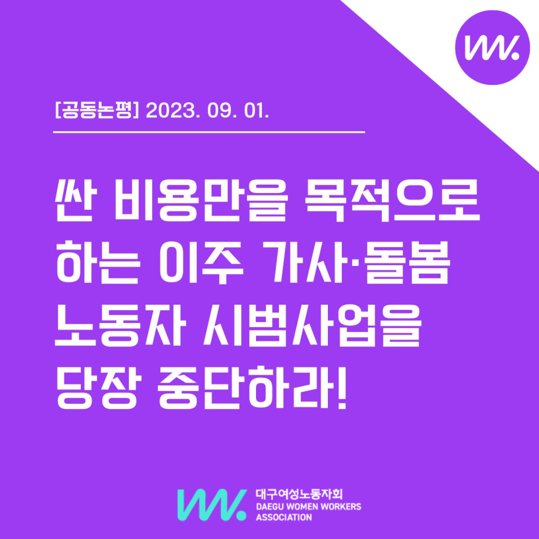이주노동자를 낮은 임금으로 이용하는 목적으로만 설계된 비인권적인 본 제도는 한국사회의 공적 돌봄 공백을 더욱 심화시킬 것이다. 강제노동을 요구하는 E-9비자는 이주 노동자들의 인권을 유린할 것이며 저임금만을 목적으로 하는 제도는 인종, 국적 차별과 돌봄노동시장의 교란을 가져올 것이다. 개별 가정으로 책임을 돌린 돌봄은 돌봄의 공공성을 해체할 것이며 돌봄의 양극화를 불러올 게 뻔하다. 정부는 가사, 돌봄노동을 좋은 일자리로 만들려는 노력 없이 그저 싼 값에 제3국의 여성들에게 돌봄의 책임을 떠넘기고 있다. 양육자들은 노동시간 단축과 돌봄의 공공성 강화를 요구하지만, 정부는 귀 닫고 눈 감고 있다. 서울시의 이주・가사노동자 시범 사업에는 가사노동자가 살기 좋은 사회, 양질의 돌봄 일자리, 질 높은 돌봄 서비스, 평등한 사회를 향한 그 어떤 비전도 없다.